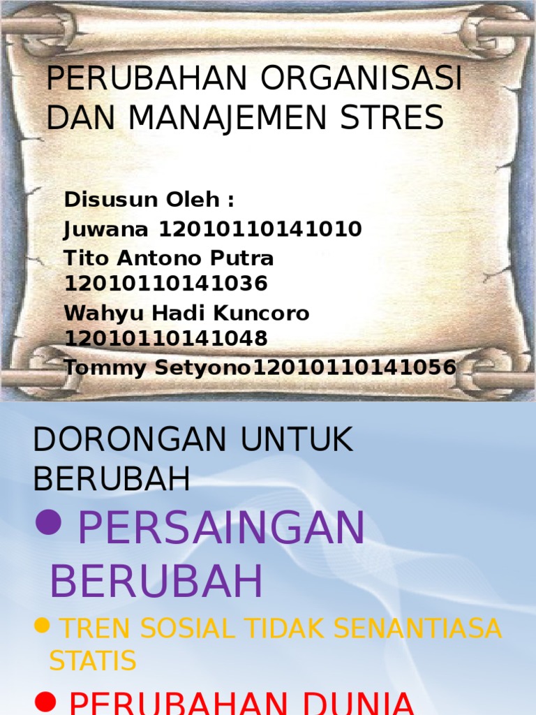 Fase ini memperlihatkan suatu keadaan dimana terjadi suasana depresi atau hiperaktif di dalam organisasi dan kondisi dimana para pimpinan harus mulai mencoba merencanakan dan Mendeskripsikan potensi sumber terjadinya stres.9. Pertanyaan diskusi perubahan organisasi dan manajemen stres pertanyaan ini disusun untuk memenuhi tugas perilaku keorganisasian disusun oleh: Tetapi kalau konflik sudah parah dan mendalam sehingga emosi sudah memainkan peranan penting, hal tersebut menunjukkan kelemahan organisasi dan menempatkannya. Menjelaskan variabel perbedaan individu yang memperlunak hubungan antara stres dan hasil. Perubahan organisasi dan manajemen stres dorongan untuk berubah dewasa ini semakin banyak organisasi yang menghadapi lingkungan dinamis dan terus berubah yang selanjutnya menuntut agar organisasi itu menyesuaikan diri. Umumnya,, stres akibat kerja terjadi ketika seseorang tidak dapat memenuhi tuntutan atau kebutuhan dari pekerjaannya. Dari titik pandang organisasi, manajemen mungkin tidak peduli bila karyawan, mungkin tidak peduli bila karyawan mengalami tingkat stres yang rendah sampai sedang. Stres dalam pekerjaan dapat dicegah timbulnya dan dapat dihadapi tanpa memperoleh dampaknya yang negatif. Stres yang terlalu besar dapat mengancam kemampuan seseorang untuk menghadapi lingkungannya. Jika tidak maka bersiaplah organisasi tersebut untuk mati. Cara mengubah budaya organisasi 1. Perubahan merupakan suatu pergantian kondisi dari kondisi lama ke kondisi baru, modifikasi sebuah kondisi atau penambahan terhadap sebuah kondisi.