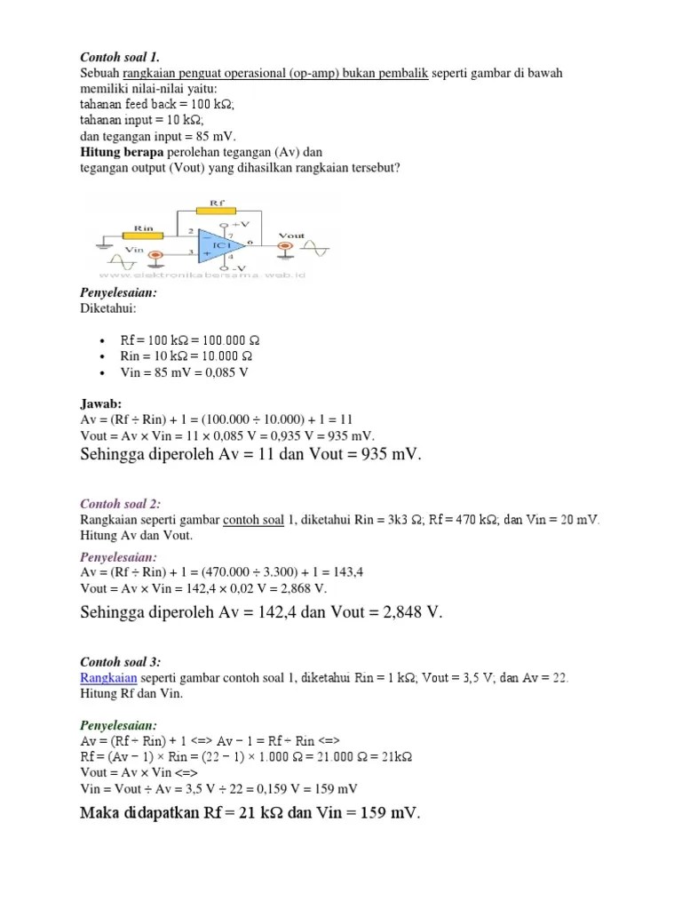 Karena tahanan feedback rf sejajar dengan amplifier, maka tegangan output v0 sama . Input masukan op amp seperti yang telah dimaklumi ada yang dinamakan input inverting dan non inverting. Inverting dan noninvertingamplifier, summing amplifier, . Hitung berapa perolehan tegangan (av), tegangan output (vout) dan tegangan catu daya (vcc) pada rangkaian tersebut? Menuliskan rumus untuk menghitung contoh soal desibel pada.