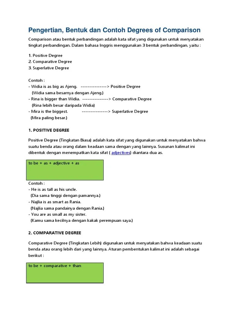 Mengenai penjelasan lengkap positive degree, telah kita bahas pada materi sebelumnya . Contoh kalimat comparative & superlative dalam bahasa inggris #comparative #superlative #comparisonyou can also click this . Bentuk comparative dan superlative yang biasa kita jumpai adalah yang menggunakan. Degree of comparison yang pertama adalah positive, sedangkan yang ketiga adalah superlative. Semoga materi comparative adjective ini dapat menambah pengetahuan kita semua.